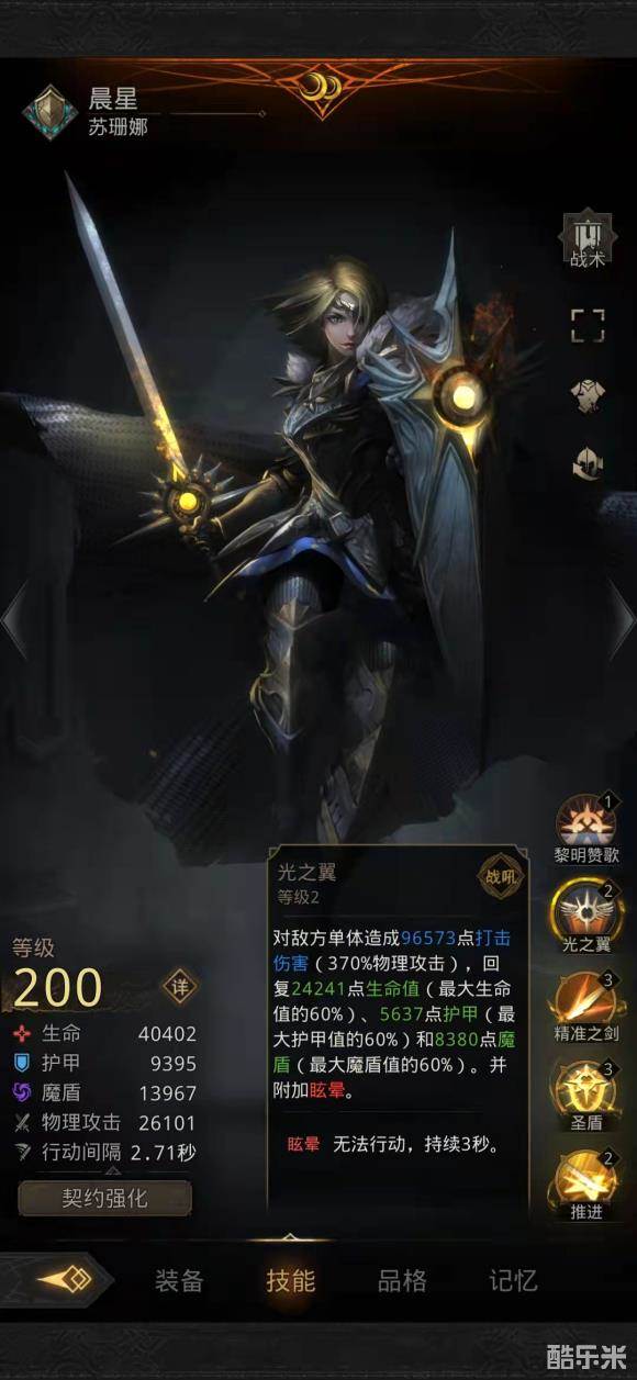 1、战吼技能光之翼:回血、回盾,这个没什么好说的,所有的坦克基本都一样,附加效果,晕眩3秒,这个非常关键,把负面效果持续时间洗满,可以晕6秒,6秒什么概念,一局BOSS基本都是60秒左右狂暴,18秒免疫,也就是说可以打出3个晕眩,18秒的晕眩,是非常恐怖的,而且手动操作可以延迟6秒狂暴时间,控制yyds。