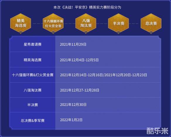 《决战!平安京》精英实力赛S3将于2021年11月29日正式开赛!本届赛事在为实力玩家提供高水平竞技赛场的同时,也会通过输送青年选手来助力平安京职业联赛青训体系的完善。本次赛事分为两个赛道:正赛赛道和娱乐赏金赛赛道。正赛赛道将通过报名海选角逐出16支高端玩家实力队伍参赛,通过12个比赛日的激烈角逐,决出精英实力赛S3的冠军。表现出众的选手还将获得进入职业联赛青训营参加线下集训的名额和额外个人赛事奖金奖励。娱乐赏金赛赛道将通过海选赛选出最强几支的队伍,在7天内不断挑战高水平的主播玩家,胜者即可赢得奖金!