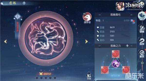 不仅如此,宠物图腾也有多种功能,目前共有融心、破镜、焕神、篆灵4个,图腾之力会给予不同的技能,稀有技能仅在高品质图腾上出现。其中融心是图腾通过消耗其余闲置图腾进行升级,提高基础属性;破镜是图腾通过消耗破镜材料进行突破,提高基础属性和图腾之力;焕神则是图腾通过消耗焕神材料和同品图腾进行觉醒,大幅提高基础属性;以及最后的篆灵,当镶嵌3个对应类型的篆灵时,将激活图腾之力效果。