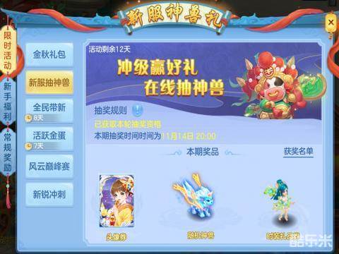 升级赢好礼,在线抽神兽, 新服神兽礼活动将在本周新服开启,届时将会有头像券,高级坐骑,随机神兽等惊喜大奖相送,只要达到对应等级要求,并在活动时间段内在线即可参与抽奖,各位少侠不要错过哦。