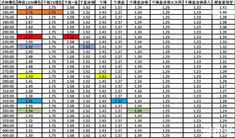 只上千姬的时候,式神爆伤小于160,大公主120%爆伤的提升开始领先千姬,爆伤越低,大公主提升越高