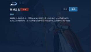 金蝉的定位是一名中单法师,但是,他的被动技能锦斓宝衣,却是一个强力减伤技能。对局中,金蝉受到的单次伤害超过最大生命值的10%后,将会减伤45%,这让金蝉拥有了极为出色的生存能力。要知道,45%的减伤放在整个王者峡谷,也是数一数二的强力效果。