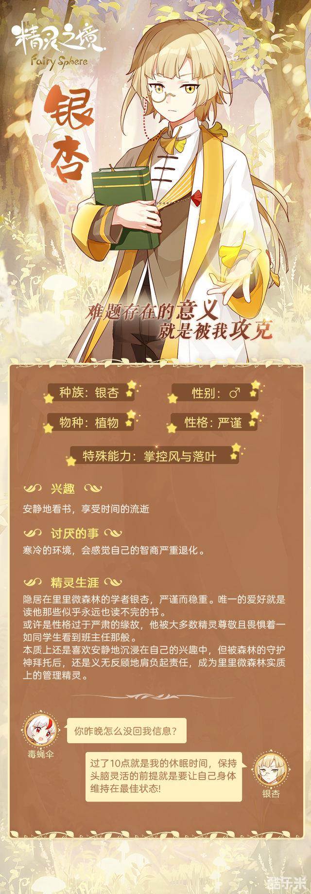 《精灵之境》是一款可爱3D箱庭装扮手游,游戏中银杏隐居在里里微森林的“老学究”,一直以来都很严肃,喜欢安静地沉浸在书籍之中,下面小编就给大家带来了《精灵之境》银杏立绘图鉴介绍,不清楚的小伙伴们一起来看看吧。