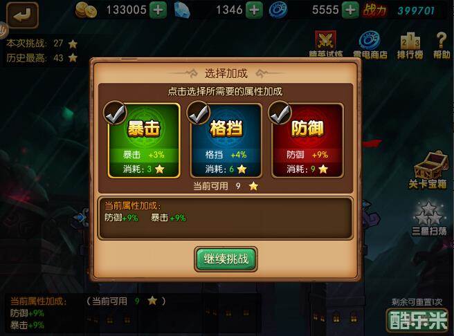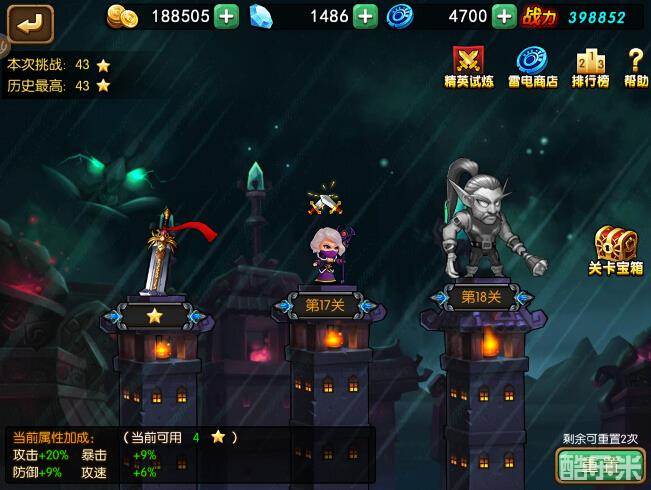 当玩家达到18级时,我们就可以跟随游戏的指引来到雷电王座当中了。在这个模式中,各个BOSS的三个难度选项也对应着三个不同的奖励——1、2、3个星星。消灭三个BOSS之后,我们可以通过获得到的星星升级团队的生命、暴击、攻击、血量等等不同属性。当然消耗星星越多的属性往往就是最优秀的那一个啦。