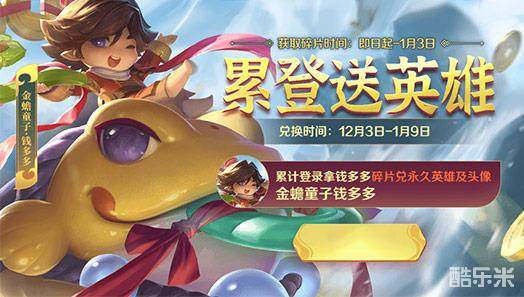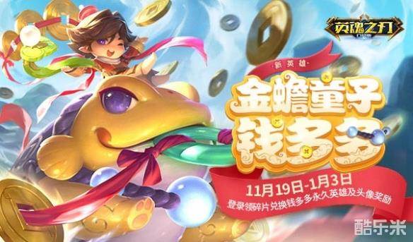 11月19日-1月3日,各位玩家可以登录游戏领取钱多多碎片,免费兑换金蟾童子钱多多永久英雄及头像奖励!