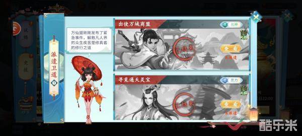 每期派遣卫道,万仙盟会发布不同的事件供各位掌门派遣弟子去参与,而不同的事件对弟子的属性要求不同,每个事件掌门最多派遣5个弟子参与,最终按照该事件要求的属性对参与派遣门派的所有弟子的属性之和进行排名,排名前20的宗门能领取相应的奖励。
