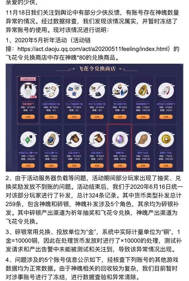 在公告中,官方提到问题出现在去年的祈年活动中,因为发奖时服务器负载等的问题,部分玩家奖励发放有延迟。活动结束后,官方针对这些玩家补发了奖励,但因系统将需要补偿的神魄按照碎银的逻辑进行计算,导致发放了大量神魄给一些玩家,现已对涉事的账号做出暂时冻结处理,并进行数据检查和异常清除。对于这种失误官方再度道歉并再给全服玩家发放15000绑点的补偿。