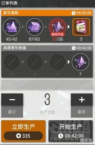 作战经验×100:需绿方块×3+绿三角×2+绿菱形×2,加工时间每批次1分钟,缺省时间每批次15分钟[(3+2+2)×2+1]