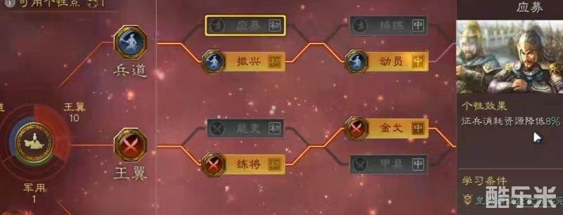叫阵是军用的终极个性,效果是可以使得对方城池中留存的非守城的军队强制出生朝着我方移动,这样就相当于直接将对方城池里的机动部队调出来了。出城的军队就不能受到守方的加成,这样战斗起来就更轻松一些。这也是攻城队必须要点出的一个效果。兵道选择的是应募,操练和号召,其中应募的效果是减少征兵消耗的资源,其实攻城队就是以兵换兵,将对方城池中的兵力消耗掉,所以需要的士兵是很多的,降低了资源消耗可以减轻压力。