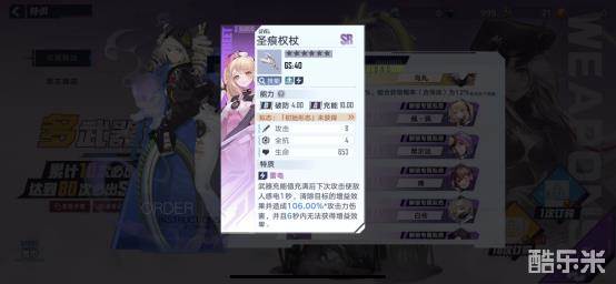 【圣痕权杖】武器定位是治疗,增加的属性为攻击、全抗和生命值,作为远程治疗角色,这样的属性加成让其在战斗里能抗更多伤害。武器的特质为雷电,在充能值满以后,下次攻击会使敌人感电1秒,清除目标身上的增益效果和造成伤害,并使目标在一定的时间内无法获得增益。这个效果能在实战里,让敌人增益效果形同虚设,尤其在PVP对战里可以很有效的克制对手。