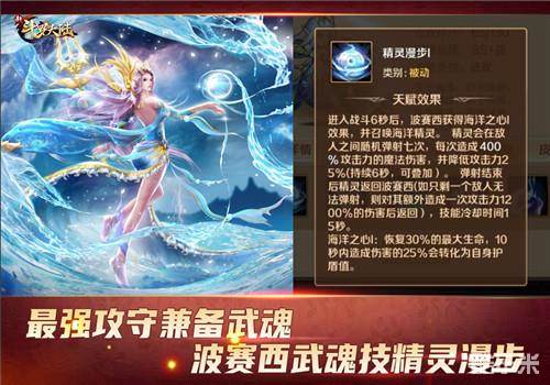 进入战斗5秒后,精灵漫步就会被触发,精灵会造成弹射伤害并降低敌人攻击力,如果是单挑敌人还会造成巨额伤害,除此之外的海洋之心还会带给波赛西大量生命值和护盾。