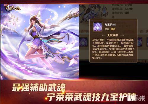 《新斗罗大陆》九彩宁荣荣的武魂技九宝护体。在战斗开始后,宁荣荣将会获得九宝护体效果,持续9秒,攻速将会提升百分之10,攻击和双抗会提升百分之65;每秒可以恢复最大生命值百分之6,还能减伤并让目标攻击者降低能量和攻击力。