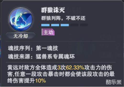 注:该技能旨在为黄远提供护盾、减伤及增伤效果,目前被开发的情况一般,因输出C位较多,且增伤效果需要经过多回合叠加,现阶段效果一般,在官方退出需要蓄力群体爆发的场景中或许可以被开发,在达到10万年魂环后可以达到持续输出效果,现阶段主要使用的为巨蟹系4技能的为友方增伤的效果。