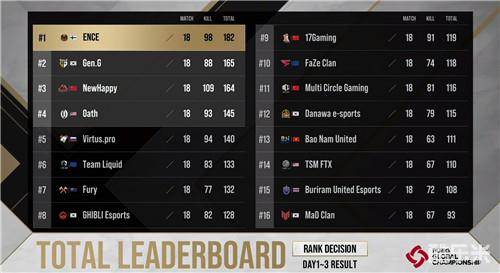 来自欧洲赛区的ENCE战队拥有丰富的大赛经验,在本次PGC排位赛中,他们展现出优异的运营与作战能力。首日的比赛中,ENCE战队虽然未能吃鸡,但积分仍保持在前列。来到第二天,ENCE战队越战越勇,在最后一局比赛中成功收下残编的BN战队和FURY战队,拿下首鸡。而在第三天,ENCE战队迎来了爆发,通过占点收割打法,单日吃到三鸡,最终以182分的绝对优势拿下排位赛的第一名。