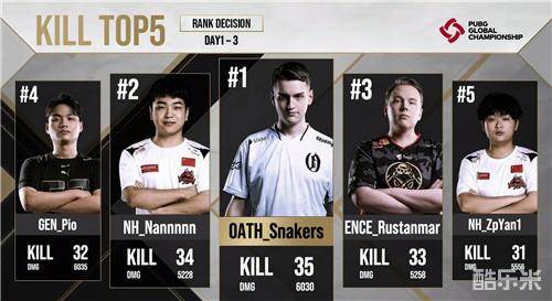 OATH战队的Snakers选手在队伍吃鸡的两局比赛中发挥了至关重要的作用,最终凭借35个淘汰数获得了排位赛的“淘汰王”称号。NH战队的Nannnnn和ZpYan1分别拿到34和31个淘汰数,均登上榜单,两人在第三日第八局瞬间团灭满编的Gen.G战队,令人印象深刻。排位赛头名ENCE战队四人均发挥出色,但Rustanmar选手最为亮眼,总共拿下33个淘汰。Gen.G战队核心选手Pio共收获32个淘汰,其优秀的个人能力屡次成为队伍成功破局的关键因素。