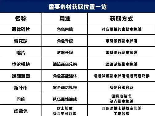 游戏中有众多的资源,各类资源又该去哪里兑换或者刷取,整理了以下重要资源,大家前期能轻松找到掉落位置。