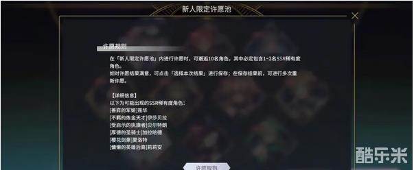 新人限定许愿池:在「新人限定许愿池」内进行许愿时,可邂逅10名角色,其中必定包含1~2名SSR稀有度角色。如对许愿结果满意,可点击【选择本次结果】进行保存;在保存结果前,可进行多次重新许愿。