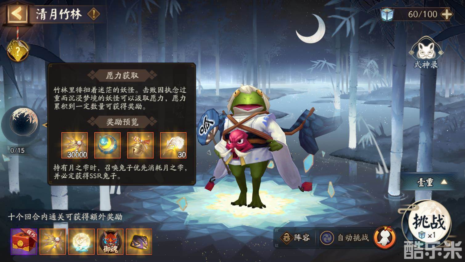阴阳师们击败清月竹林中的妖怪后,将获得「愿力」。累计一定数量的「愿力」可获得「寒月枝」、「唤梦铃」、「月之雫」等奖励。
