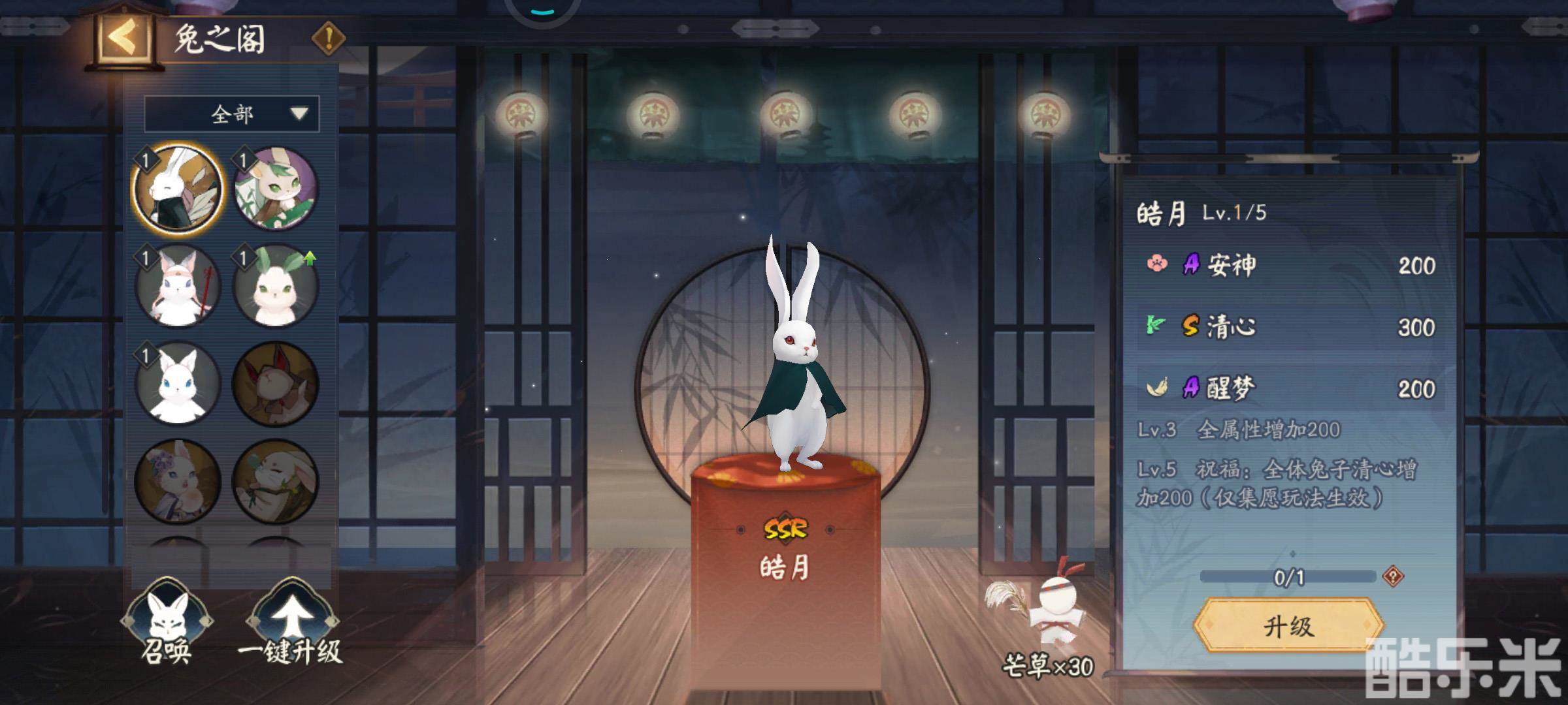 兔子们拥有「安神」「清心」「醒梦」三种属性且每个兔子的属性值不同,阴阳师可通过转化不同数量的「芒草」来获得已解锁的兔子。
