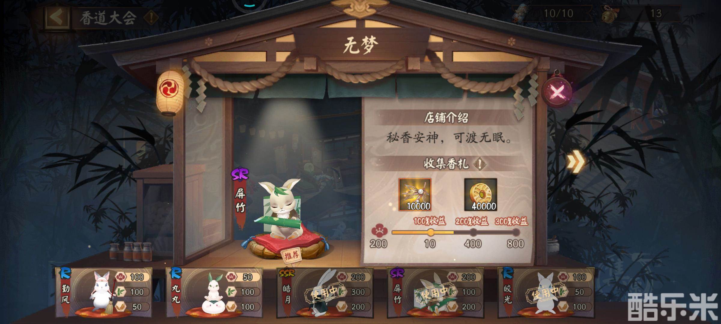 大会上对每个摊位有不同的制香属性要求,兔子制香属性越高可获得的放置收益奖励越高。阴阳师们可通过消耗重复类型的兔子进行兔子的属性提升。