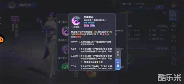 魔蛛二技能,对面控制系魂师行动前,对控制系魂师进行一次普攻。可以吃到普攻特效,且普攻后会降低精神力,这个被动是克制高速火舞,以及其他魂师的神技,缺点是如果目标身上不带毒,那可能就挂不上状态。