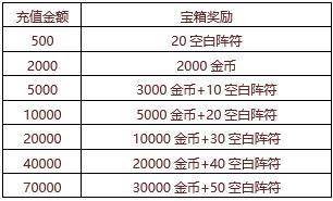 【活动内容】金币奖励满额返还,额外赠送大量空白阵符,天地水火,风雷山泽,奇门阵符,尽收囊中,一切尽在本期月末超值大放送。
