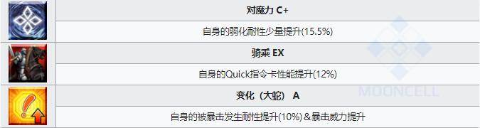 1.对魔力 C+:自身的弱化耐性少量提升(15.5%)