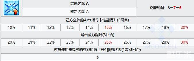 付与己方全体:Arts指令卡性能提升10%~20%(3回合)