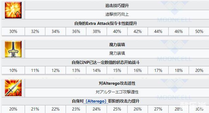 3.对Alterego攻击适性:自身对【Alterego】职介的攻击力提升20%~30%