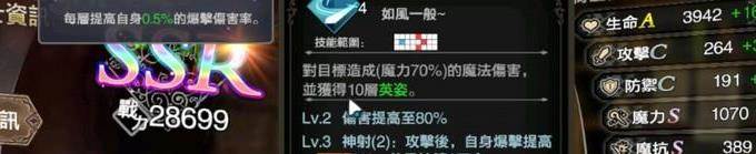 技能方面普攻“流风斩”可以获得10层的英姿,每一层提高0.5%的暴击伤害,技能升级可以提高伤害并获得神射效果,在攻击之后自身暴击提高30%,效果持续2个回合。