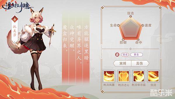 托美莎,古希腊妖狐,拥有鬼影莫测的身法,传说自古以来从未被人所狩猎,现幻化为人形,感知魔盒即将觉醒,特地前来冒险大陆与冒险者一同封印潘多拉魔盒。