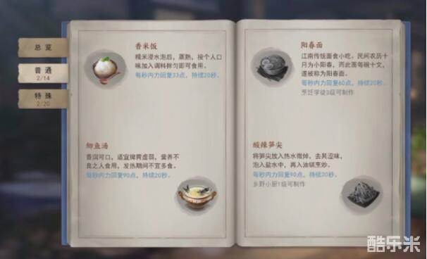 3,一般食物都是可以帮助我们恢复生命值的,以及内力,另外还有一些食物有一些特殊效果,我们在打boss的时候,就可以使用来增加我们的属性;