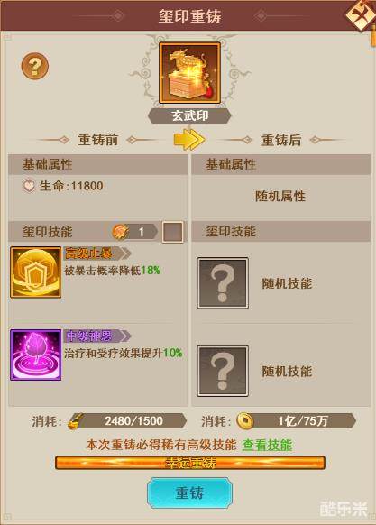 首先是玺印重铸必备的材料,而玺印品质越高,拥有的技能等级越高且数量越多!!!(ps:为了节约材料,建议只重铸高品质的玺印)
