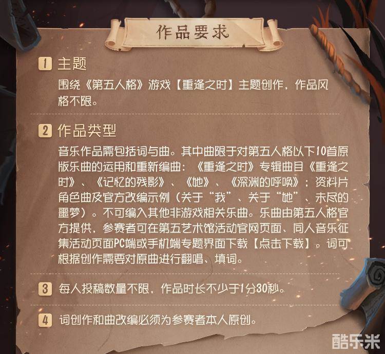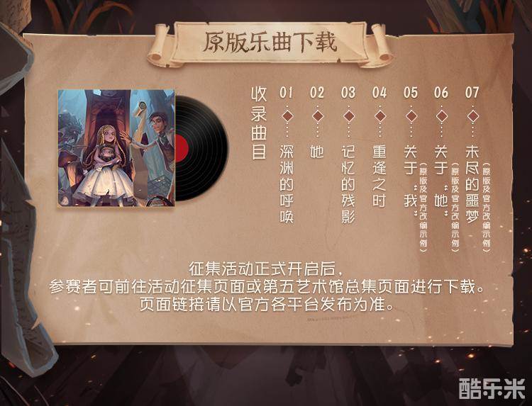 本次同人音乐征集活动对于作品风格不设限制,参赛者只需根据规则,围绕《第五人格》游戏“重逢之时”主题创作,作品应包含词和曲,乐曲需对官方给出的10首原版乐曲进行运用、重新编曲,作品时长不少于1分30秒即可。