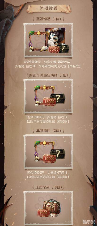 “至臻馆藏”奖项的获奖者可获得30000元现金奖励,还可获得本次活动全新设计的限定动态头像-曼舞芳华、限定头像框-巨匠Ⅲ以及四周年限定周边礼盒,获得“原创作词最佳演绎”、“典藏曲目”奖项的侦探也可获得限定头像框-巨匠Ⅲ和其他丰厚奖励,超多惊喜,带你感受专属于四周年的欢乐!
