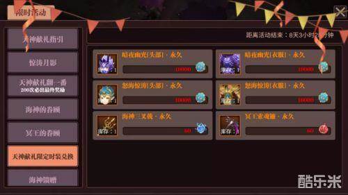 2.【时装抽奖-惊涛月影】参与时装抽奖,可以获得“怒海惊涛”时装和“暗夜幽影”时装。限定时装也可通过——时装币/海纹宝石/石榴果实,在活动期间内进行兑换。
