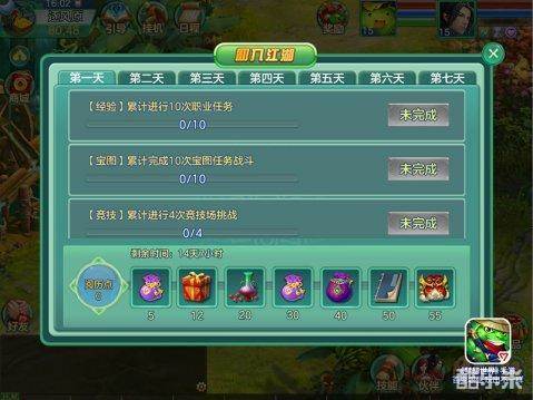 玩法介绍:少侠新角色等级大于15级后,将会获得7日任务集,每日完成一定任务即可解锁当日奖励。