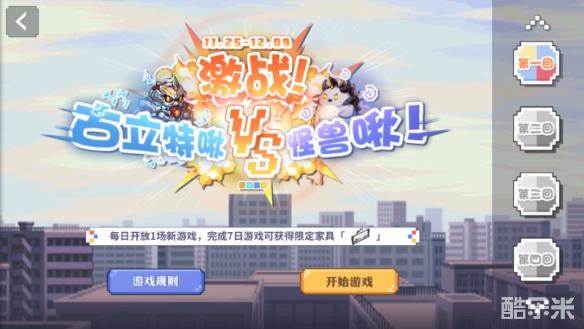 12月1日为止每日0点开放1回新的游戏,共计7回,可累计。第1回至第7回完成后可以获得【外观装备箱SSSS】及【弧光结晶150】,第7回还可以获得限定家具挂画「都市激战!」