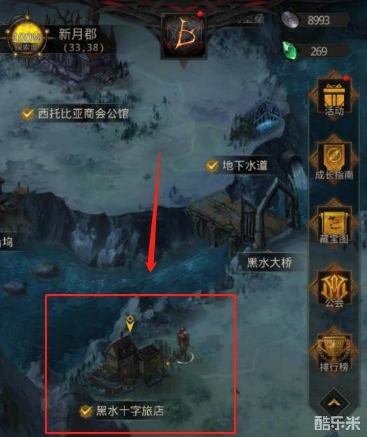 1、进入游戏后解锁图2新月郡,进入该图后找到黑水十字旅店。