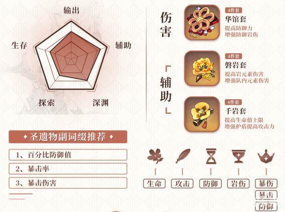 2、原神2.3版本阿贝多培养装备方面比较推荐的有三套,第一套是华馆套,这一套圣遗物主要会带来防御力和岩伤的提升,对于阿贝多的伤害提升还是很不粗哦的,第二套是磐岩套主要提升岩元素伤害,元素伤害的提升比较高,第三套是千岩套这个装备提升的是生命上限,增强护盾的同时提高攻击力,后两套是比较适合辅助来选择的。