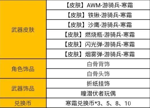 游骑兵寒霜夺宝的奖池内容极为丰富,主要奖励是AWM-游骑兵大套装的寒霜皮肤。当然,大家期待已久的白骨背饰、白骨头饰也会出现在奖池中。除此之外,奖池中还有瞳潜伏者玩偶、折纸挂饰以及3-10个寒霜兑换币。下图是游骑兵寒霜夺宝的奖池详单,请大家自行参考。