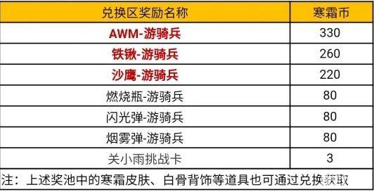 瞳玩偶和折纸挂饰大家都非常熟悉,这里就不多介绍了。奖池中还可以抽到3、5、8、10个寒霜兑换币,可用于保底兑换道具奖励。除了上述奖池中的所有道具之外,寒霜兑换区还有返场的AWM-游骑兵大套装和关小雨挑战卡。这些经典武器大家都很熟悉,这里就不赘述了,大家可以参考下图了解。