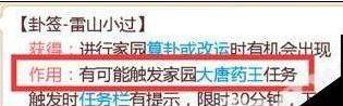 算卦只是改运,不是改风水,增加风水值得靠家具,但是风水值越高玩家家园的运势就越好,接到任务的可能性越大,而卦的上签、下签又和接到的任务好坏有关系,神秘事件有4种,可以获得元气丹的就只有祥瑞事件,如果玩家是上签,触发这个任务的可能性比较大。