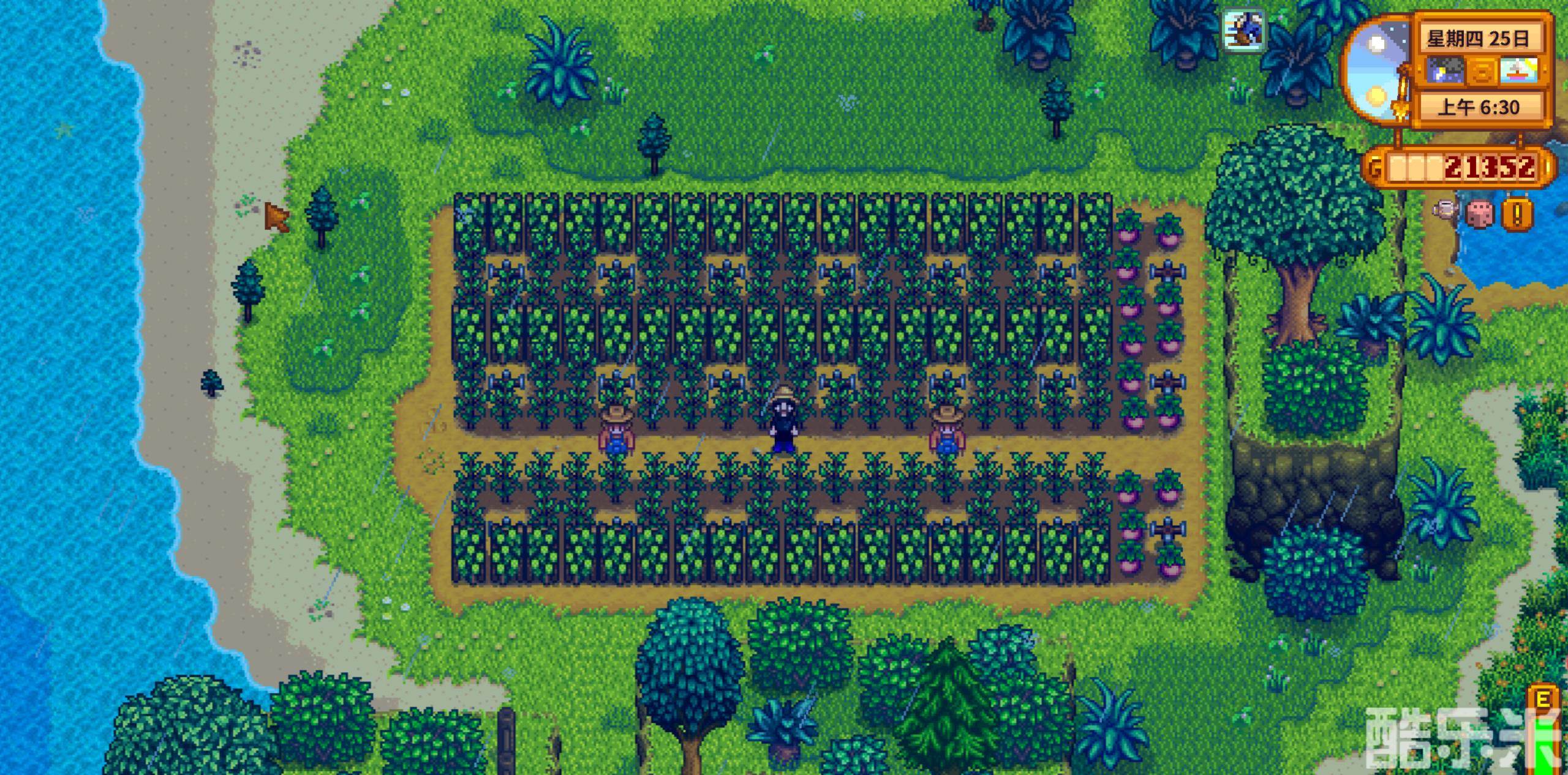 在所以可以供选择的初始农场中,可以说沙滩农场是最难的,没有之一,这点在中后期过渡上特别明显,因为沙滩农场有一个特别重要的限制就是不能使用普通洒水器,但是可以使用最高等级的洒水器——铱矿洒水器。