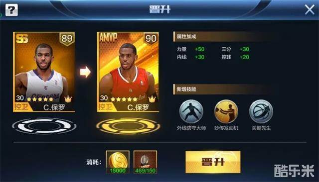 保罗晋升AMVP后,三分,内线+30,力量+50,控球+20,妙传发动机提升到10级,关键先生,外线防守大师提升到7级,晋升后的保罗得分能力得到进一步提升,同时防守能力也得到强化,控球的提升也让保罗带球能力更加显著。