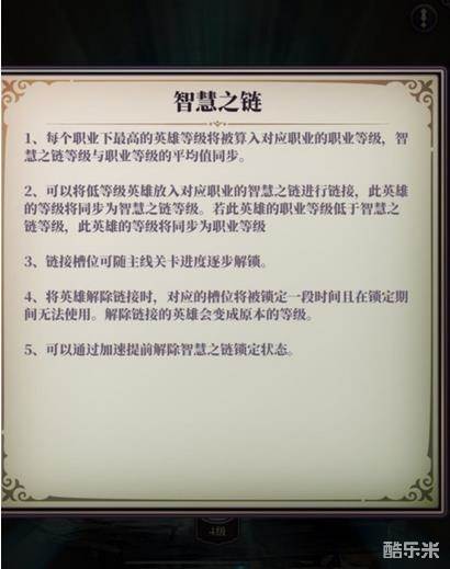 3.而智慧之链的升级,主要仰赖于各种主线任务的解锁不断推图,智慧之链的等级会随着最高等级的英雄的等级而提升。