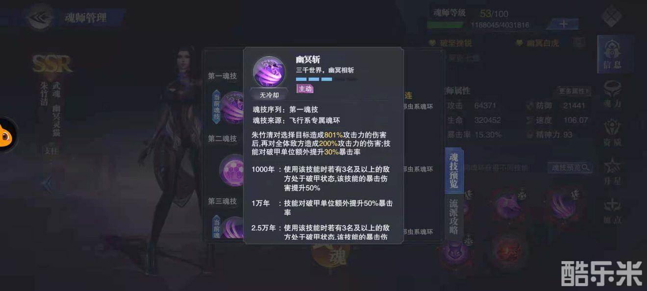 幽冥白虎是我觉得可以使用的一个武魂融合技,全体破甲并且对主目标群体协战,可以触发所有普攻特效(猫咪追击、尘心普攻额外段数、老虎变身后嘲讽等),并且提升朱竹青前2回合的普攻伤害,但是融合技平时不推荐用消耗大收益不高,8人阵面对单体boss在回合不多的情况下可以使用。台词动画还是很帅的:幽冥铸刀,白虎着甲,粉碎一切吧!