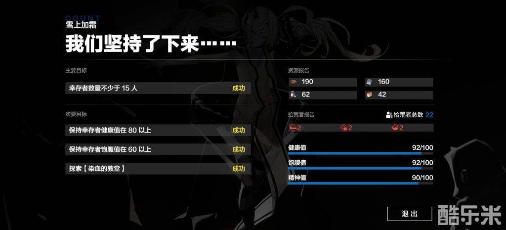 5.差不多在四五天的时候会死几个人口,不要担心因为探索队会带人口回来。大概在前中期的时候就可以每天食物和药品给所有人拉满了(全员开始能吃饱饭的时间点大概就在死人口左右,很残酷对吧,死了人就能吃饱了)第二关资源很够,不用克扣。