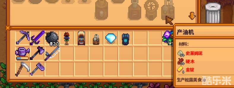 产油机是一种把不同原料转换成油的工匠合成物品,可以通过玩家耕种达到8级后解锁产油机的合成配方,然后使用50个史莱姆泥、20个硬木、1个金锭来合成,制作成本极高。