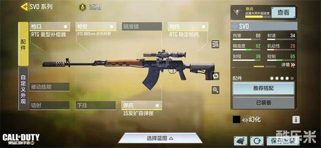 基于此瘦普推荐战士们在SVD的枪口处选择一体成型消声器,不光能延长射程,还能降低对战中战士们被发现的概率,枪管与枪托依旧采用RTC 660mm步兵枪管、RTG 稳定枪托的搭配,进一步延长射程的同时提升SVD的控制性。